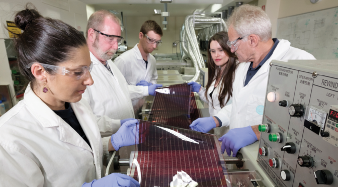 Featured image above: CSIRO, Norwood Industries and Solafast staff inspect a length of printed solar film. Credit: CSIRO