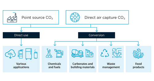 CCU technologies capture CO2 from the waste streams of industrial processes, or directly from the atmosphere, and convert it into useful new products, ranging from synthetic fuels to food and beverages, chemicals, and building materials.